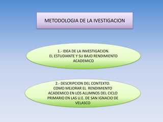 Este documento describe un estudio sobre cómo mejorar el rendimiento académico de los estudiantes de primaria en San Ignacio de Velasco. Identifica la falta de uso de estrategias de enseñanza-aprendizaje por parte de los maestros y la falta de interés de los estudiantes como problemas principales. El objetivo es diseñar estrategias para mejorar el rendimiento a través de materiales didácticos y normas de aula que mejoren la relación entre maestros y estudiantes. La hipótesis es que el uso de estrategias de