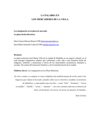 Este documento describe los imaginarios presentes en la Plaza Minorista José María Villa en Medellín. Analiza cómo la plaza es un espacio cultural donde emergen imaginarios urbanos que conforman una literatura hecha de imágenes, símbolos y narraciones a través de los intercambios que ocurren allí. También examina cómo los imaginarios de la plaza han cambiado a través del tiempo y cómo reflejan la historia y transformación de la ciudad.