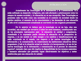 Este documento presenta los objetivos y alcances de una investigación sobre el uso de las nuevas tecnologías de la información por los docentes de la Universidad Bolivariana de Venezuela. Los objetivos generales son determinar el nivel de conocimiento, uso e implementación de las TIC, así como diagnosticar la infraestructura tecnológica disponible. Los objetivos específicos incluyen conceptualizar las aplicaciones de las TIC y medir la motivación institucional y grado de capacitación. La investigación usará técnicas como observación y entrevistas para describir el