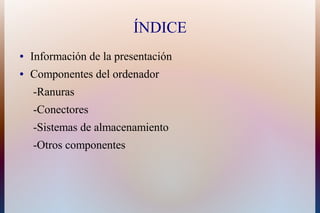 Este documento describe los principales componentes de hardware de un ordenador, incluyendo ranuras como ISA, AGP y PCI para tarjetas de expansión, conectores para dispositivos como teclado, ratón y unidades de almacenamiento, y otros componentes centrales como la placa base, microprocesador, memoria RAM y fuente de alimentación.