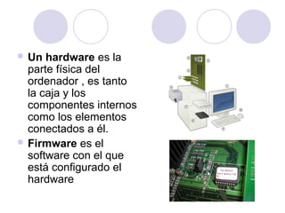 El documento describe los componentes fundamentales de un ordenador, incluyendo la CPU, la memoria principal, las unidades de entrada y salida, y los buses que permiten la comunicación entre estos componentes. Explica cómo funciona la arquitectura de Von Neumann y define conceptos clave como el hardware, el firmware, los diferentes tipos de buses y memorias, y las unidades de almacenamiento interno y externo como los discos duros y las unidades ópticas. También describe los principales periféricos de entrada como el teclado, el ratón y el escáner, y de salida