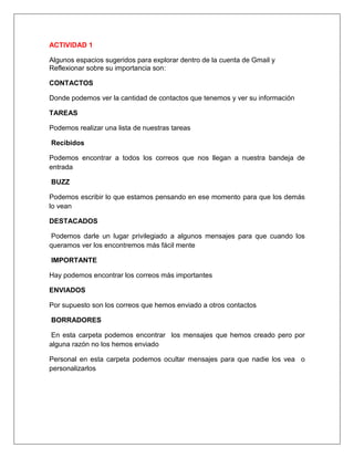Este documento describe varias herramientas de Google como Gmail, Google Maps, Google Books, Google Calendar, Google Docs y Google Translate. Explica cómo estas herramientas pueden usarse para organizar el correo electrónico, la agenda, los documentos y traducir textos. También describe conceptos como redes sociales, buscadores, páginas web, blogs, foros y chat, y cómo estas herramientas facilitan la comunicación y el intercambio de información.