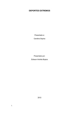 Este documento presenta información sobre deportes extremos. Define los deportes extremos como aquellos que implican cierto peligro debido a las difíciles condiciones en las que se practican. Luego describe varios deportes extremos populares como el barranquismo, paracaidismo, paintball, karting, kayak, kitesurf, bungee jumping, snowboard y bulder, explicando brevemente en qué consiste cada uno. Finalmente, concluye que los deportes extremos son cada vez más practicados y generan mucho interés entre las personas.