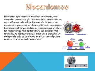 Este documento describe diferentes tipos de mecanismos que permiten modificar fuerzas o velocidades de entrada. Explica mecanismos como poleas, engranajes, tornillos sin fin y sistemas de poleas que se usan para cambiar la fuerza o velocidad aplicada. También describe cómo funcionan mecanismos específicos como poleas simples, poleas móviles, polipastos, tornos y engranajes.