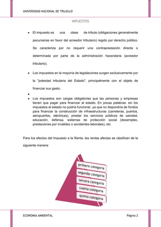 1) El documento habla sobre diferentes tipos de impuestos como el impuesto a la renta, el impuesto de primera, segunda, tercera, cuarta y quinta categoría. 2) Explica las obligaciones tributarias de los trabajadores independientes como registrarse en el RUC, emitir recibos por honorarios y pagar impuestos. 3) También clasifica los impuestos en directos e indirectos, y objetivos y subjetivos.