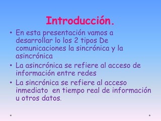Este documento describe dos tipos de comunicación en redes: la comunicación asincrónica, que se refiere al acceso no simultáneo a información a través de medios como correo electrónico, y la comunicación sincrónica, que implica el acceso en tiempo real a información mediante mensajería instantánea. También presenta herramientas de comunicación asincrónica como wikis y foros.