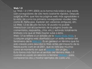 El documento describe la evolución de la Web de una versión 1.0 inicial de sólo lectura a la versión 2.0 actual que permite la interacción y colaboración de los usuarios. La Web 1.0 consistía en páginas estáticas creadas por los administradores web, mientras que la Web 2.0 incorpora aplicaciones como redes sociales, wikis y blogs que facilitan el compartir y editar contenido entre los usuarios.
