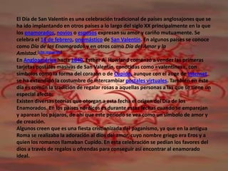 El documento habla sobre la historia del Día de San Valentín. Originalmente, San Valentín era un sacerdote en el siglo III que desafió la prohibición del emperador Claudio II de casar jóvenes. San Valentín celebró matrimonios en secreto y fue encarcelado. Fue martirizado y ejecutado el 14 de febrero. Actualmente, el Día de San Valentín se celebra el 14 de febrero y es una tradición para que las parejas y amigos expresen su amor y cariño.