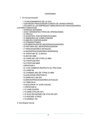 El documento describe los componentes y operación de los microprocesadores. Un microprocesador consta de una unidad aritmético-lógica, registros, y una unidad de control. Realiza diferentes tipos de operaciones como transferencia de datos, aritméticas, lógicas y de control. Los componentes internos como la ALU, registros y buses trabajan juntos bajo la coordinación de la señal de reloj y la unidad de control para procesar y ejecutar instrucciones. El documento también resume la historia y empresas líderes en la fabricación