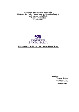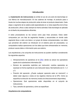 Este documento describe las arquitecturas de las computadoras, incluyendo las diferentes formas en que se pueden almacenar los operandos en la CPU (acumulador, conjunto de registros, memoria), los tipos de dispositivos de entrada y salida, el papel de la unidad de control, y algunos conceptos básicos de informática. Explica que la computadora procesa datos para producir nueva información y que su arquitectura define su diseño conceptual y estructura operativa fundamental.