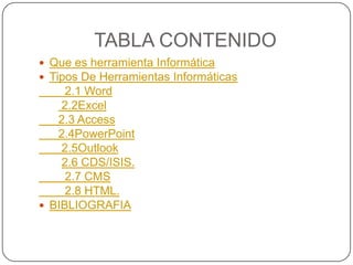 Este documento describe las principales herramientas informáticas como Word, Excel, Access, PowerPoint, Outlook, CDS/ISIS, CMS y HTML. Explica brevemente las funciones de procesamiento de texto, hojas de cálculo, bases de datos, presentaciones, correo electrónico, sistemas de información y páginas web que cumplen cada una de estas herramientas.