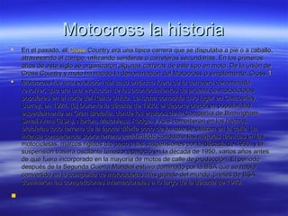 El motocross evolucionó a partir de carreras de campo a caballo o a pie llamadas cross country. En la década de 1920 comenzaron las primeras carreras de motocross en el Reino Unido. La popularidad de este deporte creció en la década de 1930, especialmente en Gran Bretaña donde marcas como BSA, Norton y AJS competían. Las motos fueron mejorando técnicamente para correr por terrenos accidentados, con la introducción de suspensiones y horquillas oscilantes. Después de la Segunda Guerra Mundial, BSA