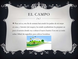 El primer documento habla sobre el agua, describiendo su composición química y su importancia para la vida. El segundo documento describe como el suegro del autor está ayudándolo a preparar un terreno para plantar hortalizas en un huerto de 140 metros cuadrados. El tercer documento explica que la parte más hermosa de una planta es la flor y que su función es la reproducción para formar nuevas plantas. El cuarto documento define una ciudad como un área urbana con alta densidad poblacional e industria y servicios.