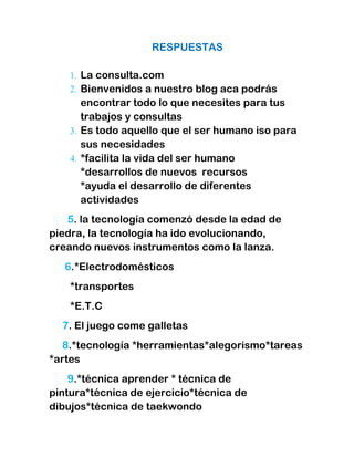 El documento contiene 20 preguntas sobre un blog educativo. Algunas preguntas son sobre el nombre del blog, que es un blog, características de la tecnología, tipos de técnica, cuantos trabajos se han subido al blog, y como crear un blog.