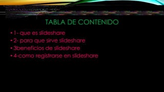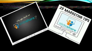 Slideshare es un sitio web gratuito donde los usuarios pueden subir y compartir presentaciones de PowerPoint u OpenOffice. Los usuarios pueden crear una cuenta en slideshare para administrar, publicar y compartir sus presentaciones fácilmente sin necesidad de adjuntar archivos pesados en correos electrónicos. Slideshare ofrece varios beneficios como permitir dar conferencias en línea sin cargar la presentación, ver presentaciones desde cualquier computadora, compartir presentaciones fácilmente con otros y subir archivos de hasta 30 megabytes.