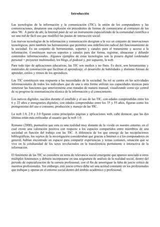 Este documento presenta una introducción a las tecnologías de la información y la comunicación (TIC) en 3 oraciones: