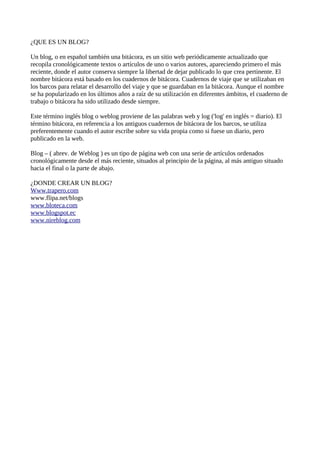 Un blog es un sitio web periódicamente actualizado que recopila cronológicamente textos o artículos de uno o varios autores, apareciendo primero el más reciente. Los blogs permiten a los autores publicar lo que crean pertinente y derivan de los cuadernos de bitácora que se usaban en barcos para relatar viajes.
