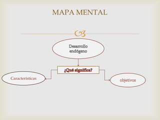 El documento describe el desarrollo endógeno y sus características. Define el desarrollo endógeno como un modelo que busca potenciar las capacidades internas de una región para fortalecer su sociedad y economía de manera sostenible. Enumera seis características clave como basarse en las capacidades y necesidades locales, estimular la democratización de la riqueza, organizarse de abajo hacia arriba, reducir la exclusión social, motivar la participación comunitaria, y promover nuevos estilos de vida solidarios. También presenta cu