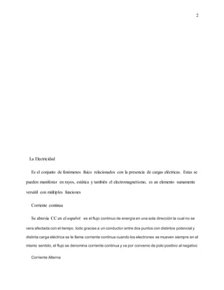 El documento describe los conceptos básicos de electricidad como la corriente continua, corriente alterna, circuitos eléctricos en serie y paralelo, y el transporte de corriente eléctrica. También explica herramientas y máquinas eléctricas como poleas, motores eléctricos y piñones. Por último, resume las leyes de Ohm y Watt que describen la relación entre voltaje, corriente y potencia en circuitos eléctricos.
