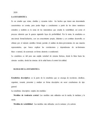 Este documento describe los conceptos y métodos básicos de la estadística. Explica que la estadística estudia la variabilidad y probabilidad en datos para llegar a conclusiones. Luego describe las ramas principales de la estadística descriptiva, inferencial y matemática. Finalmente, explica algunas aplicaciones comunes de la estadística en áreas como la educación, economía y deportes.