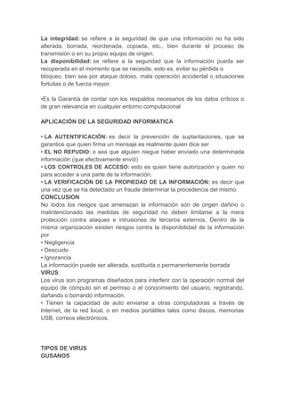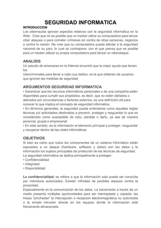 El documento habla sobre la seguridad informática y los riesgos que enfrentan los usuarios de internet. Explica que los hackers pueden usar las computadoras de otros para lanzar ataques cibernéticos o cometer crímenes, poniendo en riesgo la seguridad nacional. También describe varios tipos de malware como virus, gusanos, caballos de Troya, spyware y adware, y sus características. Finalmente, recomienda instalar software antivirus en todas las computadoras para prevenir y eliminar estas amenazas.