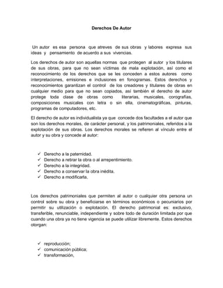 Este documento explica los derechos de autor y cómo protegen a los creadores de obras literarias, musicales, artísticas y otras. Define los derechos morales y patrimoniales que otorgan control y beneficios económicos a los autores. También describe diferentes tipos de obras protegidas como orales, literarias, derivadas y colectivas. Finalmente, explica que los derechos de autor de una tesis de grado pertenecen a los estudiantes que la crearon y que la titularidad original corresponde al autor de la obra.
