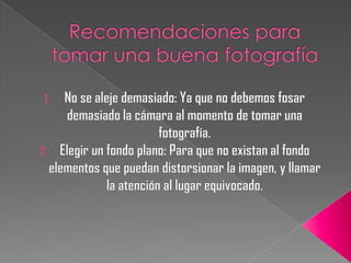 El documento ofrece consejos para mejorar la fotografía, como elegir un fondo plano, experimentar con diferentes ángulos y mantener una distancia adecuada con la cámara. También explica la importancia de los megapíxeles en la resolución de las imágenes. Además, menciona una herramienta web destinada a la edición de fotografías.