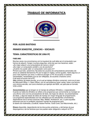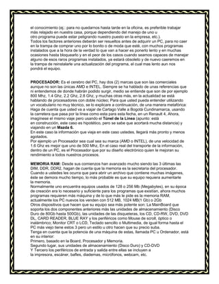 Este documento describe las características clave de una computadora personal (PC). Explica que la potencia de una PC depende principalmente de su procesador, memoria RAM y placa base. Un procesador más rápido y mayor cantidad de memoria RAM permitirán que la PC complete tareas de manera más eficiente. También menciona otros componentes como la unidad de disco duro y periféricos que afectan el rendimiento general de la máquina.