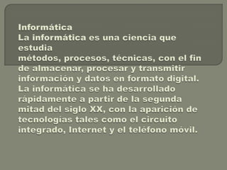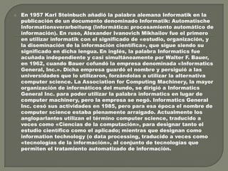El documento describe los orígenes y evolución del término "informática". La palabra fue acuñada en alemán en 1957 por Karl Steinbuch para referirse al procesamiento automático de información por computadoras. Mientras que en inglés se adoptó el término "computer science", en otras lenguas como español se utilizó una adaptación de la palabra original de Steinbuch. Actualmente, la informática engloba el estudio y aplicación de las tecnologías de la información y los sistemas computacionales para almacenar, procesar y transmit