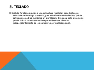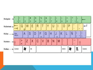 El documento habla sobre los integrantes de un equipo y las partes principales de un teclado. Describe la zona alfanumérica del teclado, que contiene letras, números y símbolos organizados en cinco filas. También describe los cuatro sectores del teclado: el bloque de funciones, el bloque alfanumérico, el bloque especial y el bloque numérico. Finalmente, menciona la importancia de la numeración de los dedos y la pulsación correcta de las teclas para una digitación eficiente.
