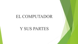 El documento describe las principales partes de una computadora. Explica que el computador es una máquina electrónica que procesa datos para convertirlos en información útil. Luego describe algunas de las partes clave como el monitor que muestra la salida de datos, el teclado para la entrada de datos, la CPU que es el cerebro de la computadora, los parlantes para reproducir audio y el mouse para navegar interfaces gráficas.