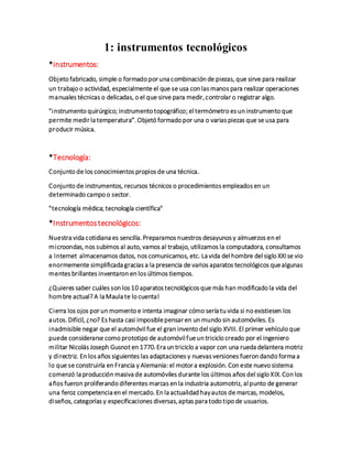 Los documentos describen varios tipos de instrumentos tecnológicos y máquinas monofuncionales. Se definen instrumentos tecnológicos como objetos fabricados que sirven para realizar tareas o actividades. Se mencionan ejemplos como el automóvil, la computadora y el celular. Las máquinas monofuncionales se clasifican según su funcionamiento (continuo, instantáneo, de efectos múltiples) y aplicación (juguetes, herramientas, didáctica). Finalmente, se explica la diferencia entre máquinas simple