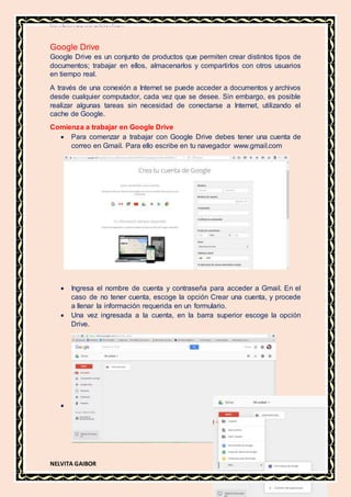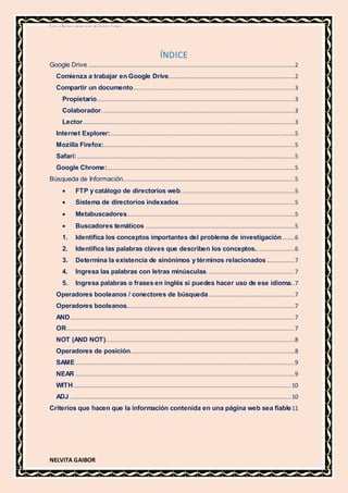 Este documento presenta información sobre Google Drive, navegadores web y búsqueda de información en Internet. Explica cómo comenzar a usar Google Drive, compartir documentos y los tipos de usuarios. También describe los navegadores web más comunes como Internet Explorer, Firefox, Safari y Chrome. Finalmente, detalla diferentes métodos para realizar búsquedas en Internet como motores de búsqueda, operadores booleanos y criterios para determinar la fiabilidad de la información en una página web.