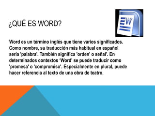 Microsoft Word es un software de procesamiento de textos desarrollado por Microsoft que permite crear y editar documentos. Se usa principalmente para elaborar documentos como artículos, informes o cartas, aunque también permite trabajar con imágenes, tablas y gráficos. Word ofrece opciones para cambiar formatos de texto, corregir errores ortográficos e insertar encabezados, pies de página y otros elementos.