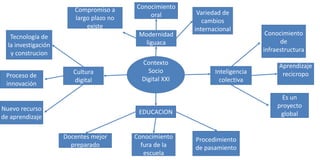 El documento habla sobre los cambios en la educación en el contexto de la sociedad digital del siglo XXI, incluyendo el uso de la tecnología para mejorar el aprendizaje a través de la inteligencia colectiva y el conocimiento compartido más allá de las aulas, así como la necesidad de que los docentes estén mejor preparados para este nuevo entorno y procesos de innovación global.
