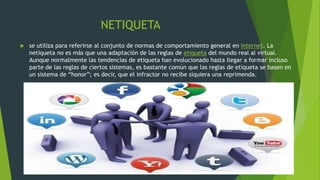 Este documento habla sobre la netiqueta y el mal uso de Internet. Define la netiqueta como las normas de comportamiento en Internet, las cuales son adaptaciones de las reglas de etiqueta del mundo real. Luego enumera 10 reglas básicas de la netiqueta como recordar lo humano, seguir los mismos estándares de comportamiento que en la vida real, respetar el tiempo y espacio de los demás, y no abusar de ventajas. Finalmente, señala que aunque Internet ofrece muchas posibilidades, también conlleva peligros y riesgos si