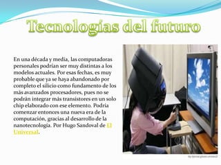El documento habla sobre las posibles tecnologías del futuro como computadoras que no usen silicio, autos eléctricos ecológicos, robots para trabajos peligrosos, y mejoras en computadoras personales con pantallas planas y sistemas operativos más avanzados. También menciona nuevas tecnologías como OLED para televisores y mejoras en portátiles, CPUs y teléfonos móviles que llamen por internet.