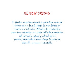 El documento habla sobre el ecoturismo y sus diferentes tipos. Define el ecoturismo como una opción viable de conservación del patrimonio natural y cultural que fomenta el desarrollo económico sustentable. Luego describe cuatro tipos de ecoturismo: agroturismo, acuaturismo, etnoturismo y turismo metropolitano. Brevemente explica en qué consiste cada uno.