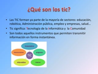 Las TIC incluyen tecnologías como la computación, internet y dispositivos móviles que permiten transmitir información de forma instantánea. Sirven para optimizar el manejo y desarrollo de la comunicación de información y generar mayor conocimiento. Las TIC han evolucionado rápidamente desde los primeros programas de aritmética y lenguajes de programación hasta convertirse en herramientas de apoyo para la educación que facilitan el acceso a la información de manera interactiva y eficiente.