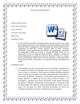 Word es un procesador de texto creado por Microsoft que permite crear y editar documentos. Ofrece plantillas para cartas, memorandos y boletines, y permite insertar gráficos e imágenes para enriquecer presentaciones y documentos. Word también incluye herramientas de diseño para crear y modificar imágenes. Es el procesador de texto más popular y se usa para crear diferentes tipos de documentos como cartas, oficios, memorandos, tesis y trípticos.