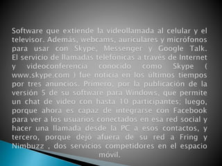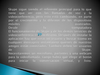 Este documento describe las características y funcionalidades de Skype y Messenger para realizar videoconferencias. Skype permite llamadas gratuitas entre usuarios, buena calidad de audio, y funciona sin configuración especial de red. Messenger permite videoconferencias con hasta 10 personas simultáneamente usando cámara web, micrófono y asistente para configurar los dispositivos. Para iniciar una videoconferencia en Messenger, el usuario debe seleccionar la opción de cámara web o audio en la conversación.