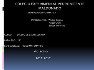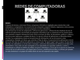 Este documento proporciona información sobre redes de computadoras. Explica los tipos principales de redes como LAN (redes de área local), MAN (redes metropolitanas), y WAN (redes de área amplia). También describe los medios de transmisión comunes como cable par trenzado, coaxial y fibra óptica, así como los conectores utilizados para cada tipo de cable.