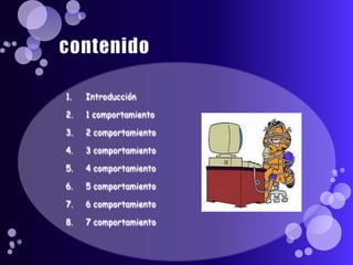 Este documento presenta 10 comportamientos digitales que las personas deben seguir para hacer un uso adecuado de la tecnología y evitar riesgos. Estos incluyen respetar a otros y su privacidad, ejercer la libertad de manera responsable, proteger la seguridad propia y de otros, usar la tecnología para mejorar la calidad de vida de forma pacífica, y respetar los derechos de autor.