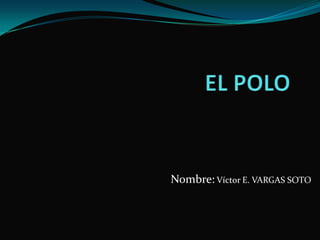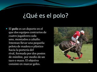 El polo es un deporte de equipo montado a caballo donde dos equipos de cuatro jugadores intentan marcar goles introduciendo una pelota en la portería contraria usando un mazo. Se originó en Persia hace más de 2000 años como entrenamiento militar. Los jugadores usan equipamiento que incluye casco, botas, rodilleras y mazo de bambú. Los partidos constan de dos tiempos de 10 minutos cada uno en una cancha de 275x146 metros delimitada por una valla de madera.