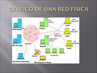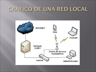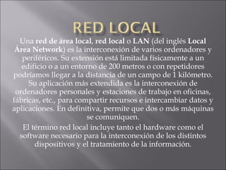 Una red local o LAN es una interconexión de ordenadores y periféricos limitada físicamente a 200 metros que permite compartir recursos. Los servidores comparten recursos hardware y software, las estaciones de trabajo aprovechan estos recursos, y los puentes y concentradores conectan diferentes redes locales.