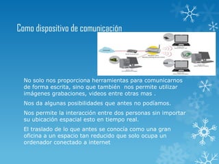 El documento describe las computadoras como dispositivos de comunicación e intercambio de ideas. Las computadoras nos permiten comunicarnos de forma escrita, con imágenes, videos y grabaciones, superando las limitaciones del tiempo y el espacio. También facilitan el aprendizaje en grupo al proporcionar herramientas como correo electrónico, videoconferencias y pizarras interactivas. Las computadoras cumplen un rol de soporte administrativo en la educación al hacer seguimiento del progreso de los estudiantes y controlar su asistencia y notas.