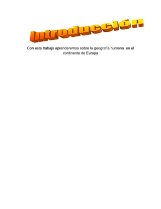 Este documento proporciona instrucciones para un proyecto de investigación sobre la geografía humana en Europa y Colombia. Los estudiantes aprenderán sobre la cultura, economía, etnografía y población de Europa a través de un ensayo de investigación en línea. También evaluarán los conceptos y características de la geografía humana de Colombia y cómo investigar sobre el tema. El proyecto incluye tareas, exámenes y recursos en línea para completar la investigación.