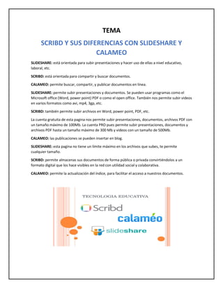 Este documento compara tres plataformas para compartir documentos: SlideShare, Scribd y Calameo. SlideShare se enfoca en presentaciones para uso educativo o laboral, mientras que Scribd permite buscar y compartir una variedad de documentos de forma pública o privada. Calameo también permite buscar y compartir documentos en línea e insertarlos en blogs.