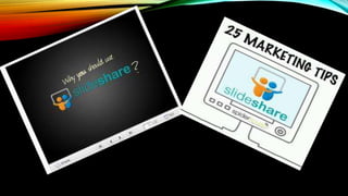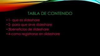 Slideshare es un sitio web gratuito donde los usuarios pueden subir y compartir presentaciones de PowerPoint u OpenOffice. Los usuarios pueden crear una cuenta en slideshare para administrar, publicar y compartir sus presentaciones fácilmente sin necesidad de adjuntar archivos pesados en correos electrónicos. Slideshare ofrece varios beneficios como permitir dar conferencias en línea sin cargar la presentación, ver presentaciones desde cualquier computadora, compartir presentaciones fácilmente con otros y subir archivos de hasta 30 megabytes.