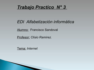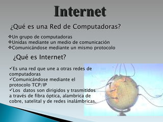 El documento habla sobre Internet y sus principales servicios y características. Explica que Internet es una red mundial de computadoras que permite compartir información a través de protocolos como TCP/IP. Describe servicios como correo electrónico, páginas web, grupos de noticias y redes sociales. También menciona la evolución de Internet desde ARPANET y diferentes navegadores como Internet Explorer, Firefox y Chrome.